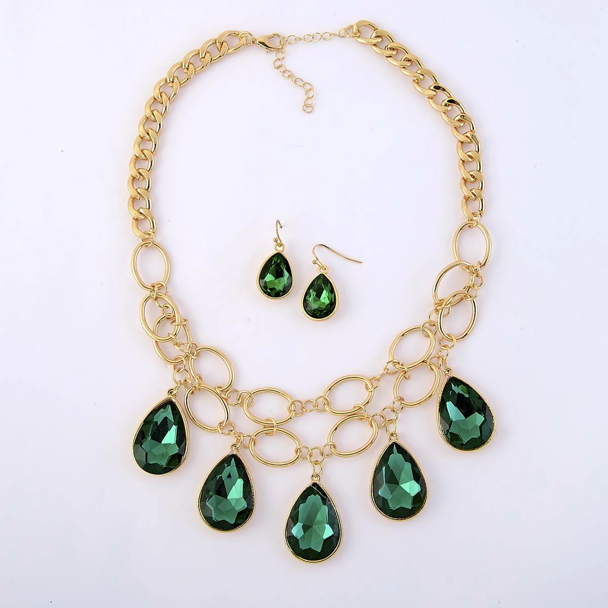 Add a pop of color to your look with the Ashley Cooper™ gold plated chain necklace with oval links and teardrop emerald glass stones including matching fish hook earrings.