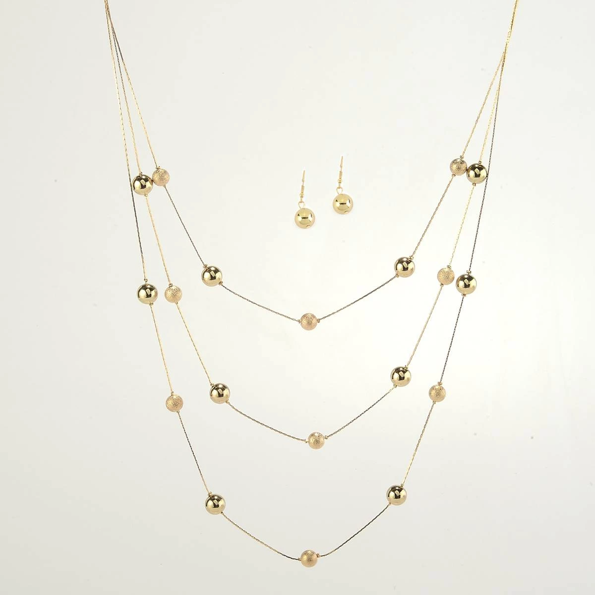 Elevate the appeal of any look with the refined style of the Ashley Cooper™ three-row illusion necklace in gold with matching earrings.