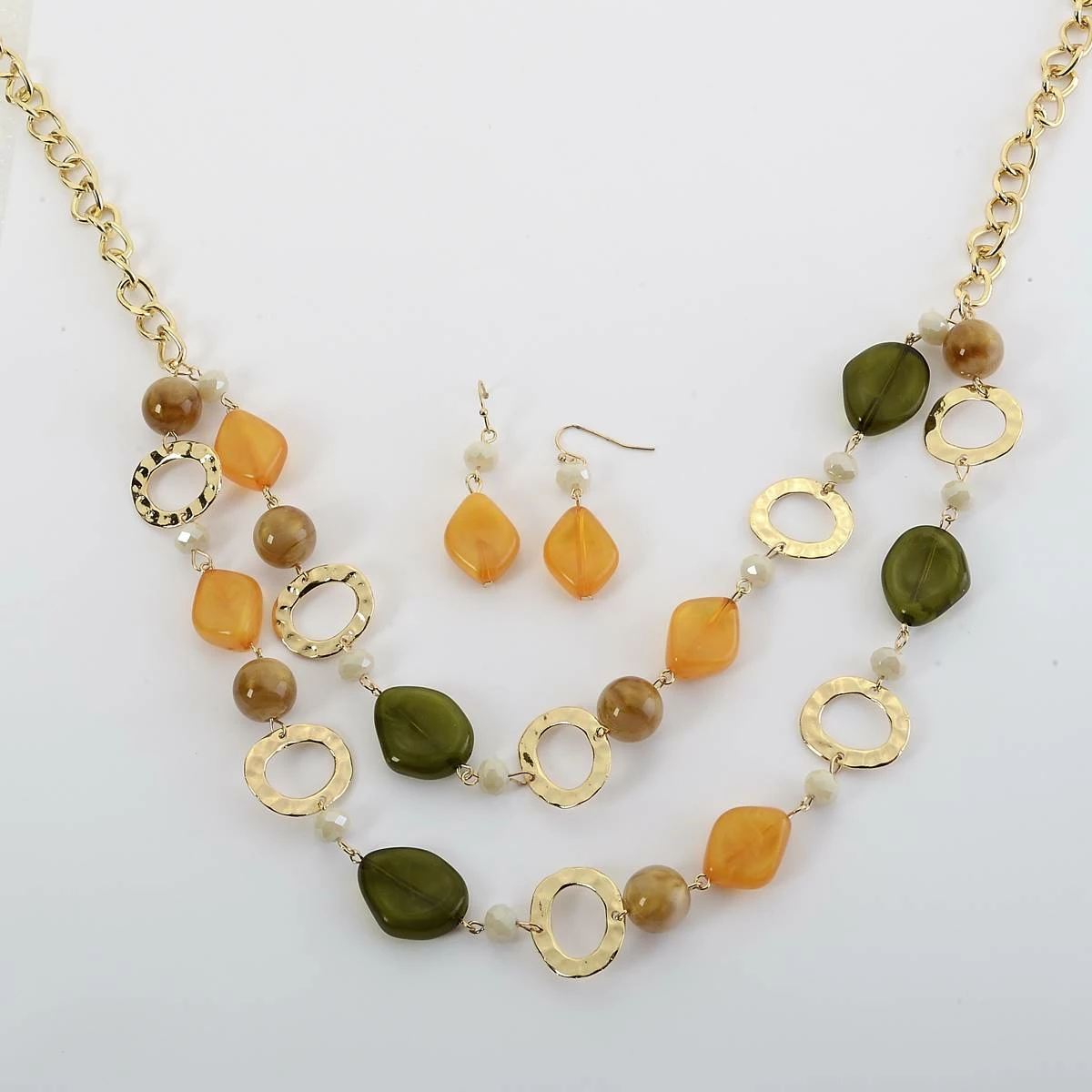 This sensational Ashley Cooper™ two-row link ring beaded necklace features olive, mustard, and tan colors and includes matching fish hook earrings.
